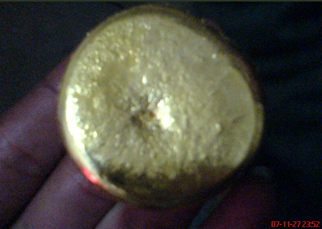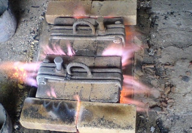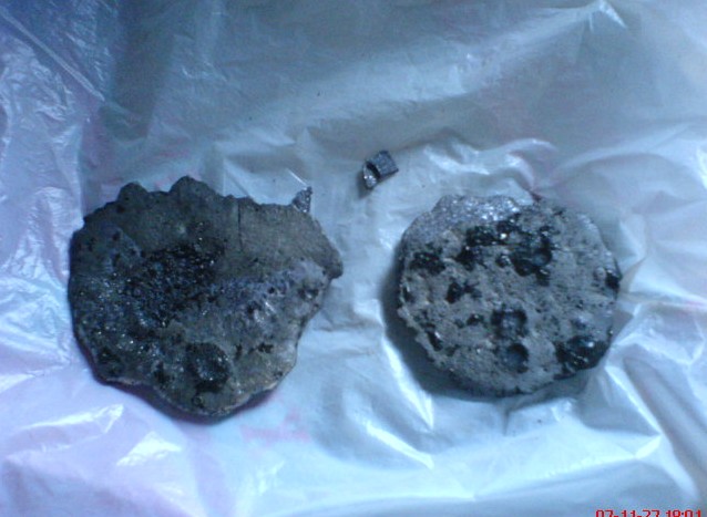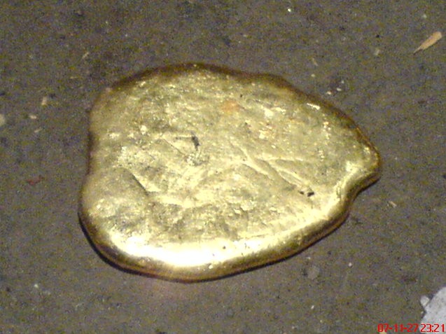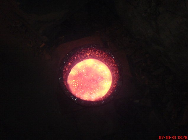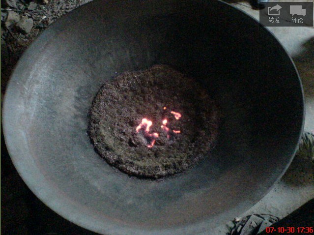 圖解:煅燒1-2小時(shí)后,炭渣溶為液體攪拌如水可出鍋,等冷卻后倒出炭渣此時(shí)黃金已和鉛沉入灌底敲出及可得。
