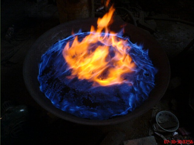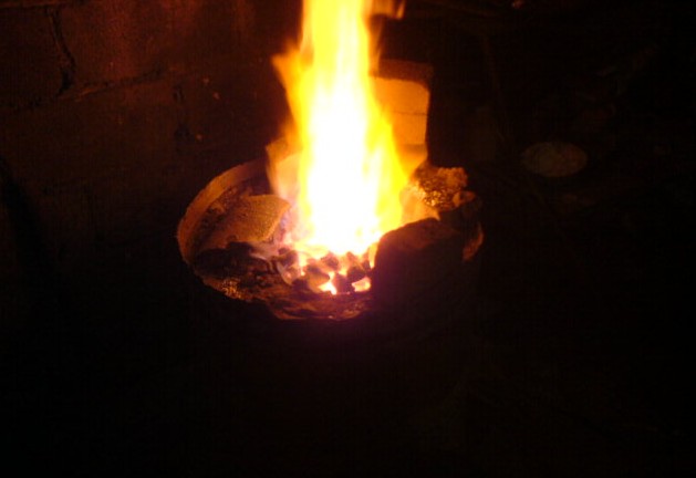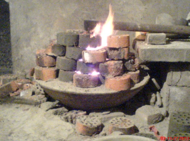 圖解:接下來(lái)是吹鉛步驟,把含鉛黃金放入裝滿水泥的大鍋中,上面放煤球或焦炭,用風(fēng)機(jī)吹然后停止吹風(fēng)使其自然升溫到1300度以上,這是鉛就氣化蒸發(fā),這一過程需要2-3小時(shí)。