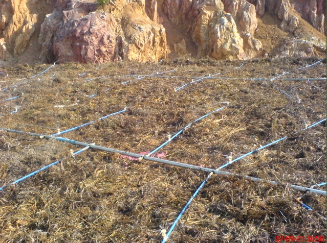 圖解:礦從山上開挖下來(lái)運(yùn)到堆浸場(chǎng)地,數(shù)量隨堆場(chǎng)的大小而定,堆場(chǎng)底部要盡量壓實(shí)不能有石塊等物還要留有2條以上的排水溝,再用彩條布鋪滿,排水溝上架木條和竹籬笆,再堆礦。