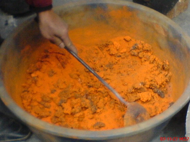 圖解:炭渣令卻后敲碎加入氧化鉛(橘黃色)和硼砂(同鹽的色澤)攪拌均勻。