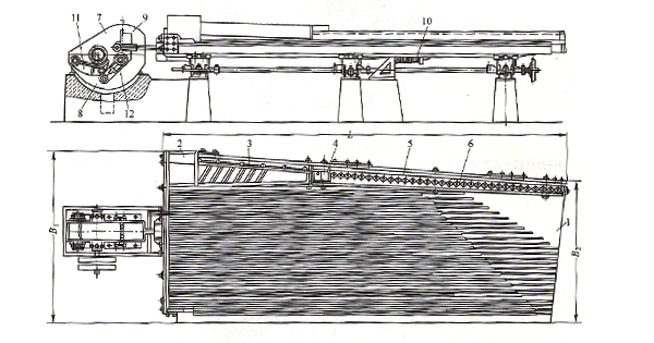 云錫搖床結構圖 1-床面; 2-給礦斗; 3-給礦槽; 4-給水斗; 5-給水槽; 6-菱形活瓣; 7-滾輪; 8-機座; 9-機罩; 10-彈簧; 11-搖動支臂; 12-曲拐杠桿