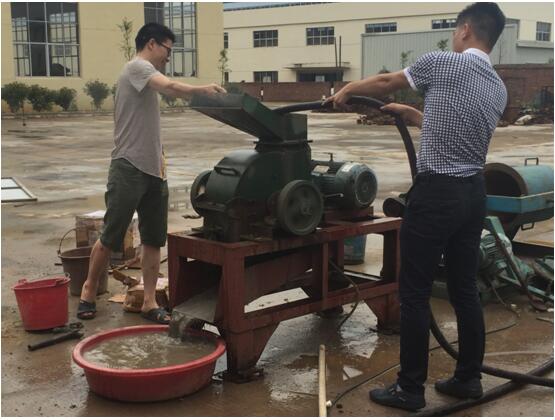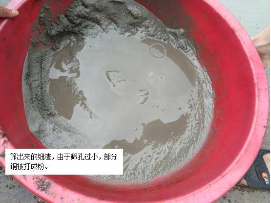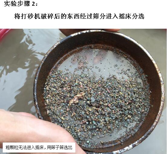 以上圖為實驗用打砂機,該機并沒有設置開啟式粗顆粒排礦口導致打砂機進料口彈出了一些銅粒,破碎過細后對這次的回收也受到了一定影響。