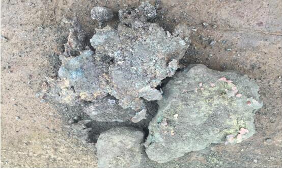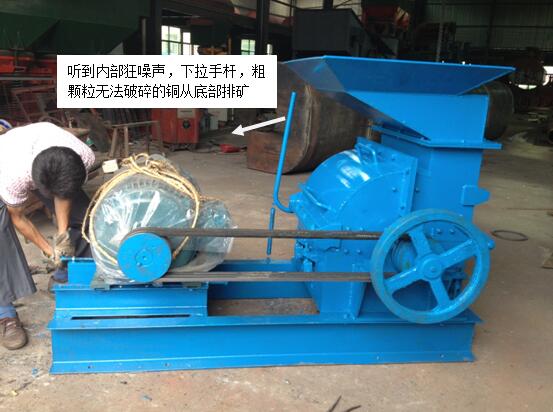 收到礦樣后(上圖為原礦),發現銅渣粒度較大,但考慮銅渣本身較脆,可直接進入打砂機,打砂機需特制專用打砂機,拉桿下拉(如下圖),可將不必破細的純銅,或打不碎的金屬,直接從底部排出。即能達到保護機器易損件使用壽命,又能保存完整的純銅。