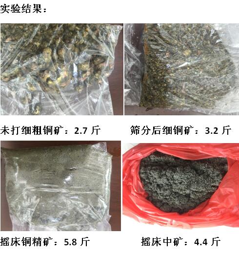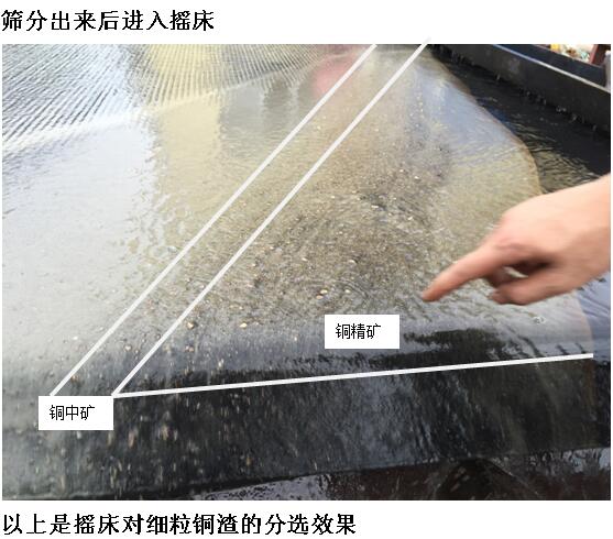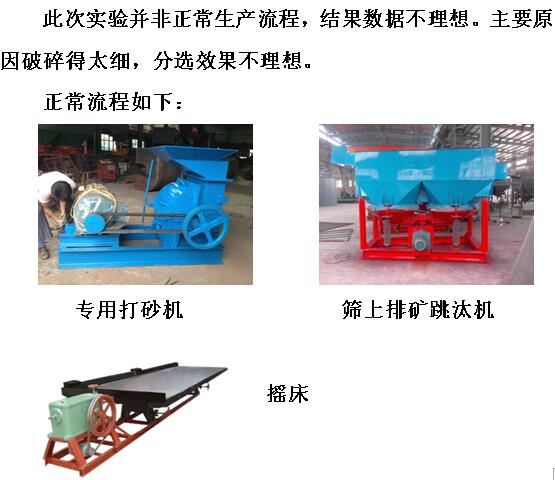 專用打砂機前面已經有介紹,篩上排礦跳汰機是流程中必不可少的設備(實驗室由于補水不夠,無法實驗該機),利用銅礦比重較大原理,能很好的將大顆篩從篩上排出,片狀銅也能有較好的回收,篩下排出的精礦通過搖床進行提純。